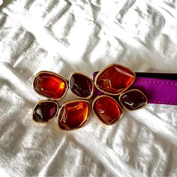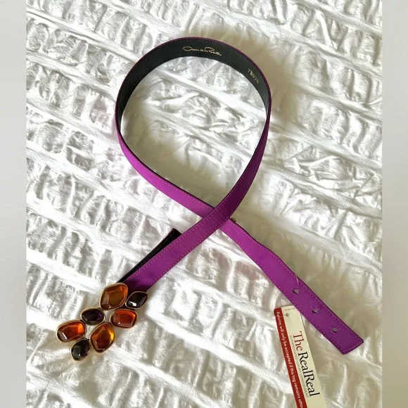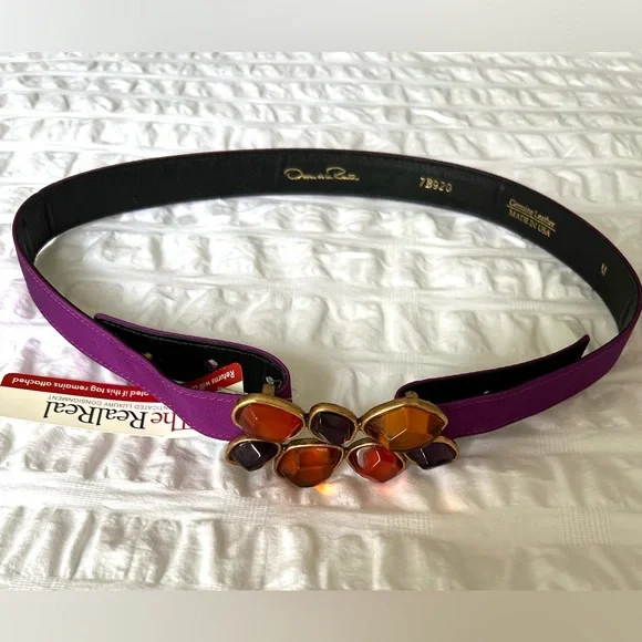 Condition: never worn.An unexpected way to upgrade a simple ensemble this Oscar de la Renta jewel-waist belt would pop against a white sheath dress or cinch a flowy tunic.Amethyst satin with leather backing.Tonal faceted stations on golden adjustable buckle.Designed to sit at natural waist.1"W.Silk.Made in USA.About Oscar de la Renta:After apprenticing at Balenciaga in Spain and at Lanvin in Paris, Dominican designer Oscar de la Renta launched his own eponymous line in 1965. His refined, ladylike looks have garnered many awards, including one in 1990 for Lifetime Achievement. In 1998, he launched a successful line of lingerie and his momentum shows no signs of waning with the collections of eyewear, fragrance, home decor, handbags, and shoes.